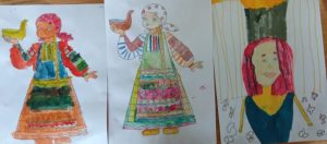 На уроках живописи в рамках тем: «Контрастная гармония (на насыщенных цветах)» и «Зарисовка фигуры человека», ученики 1 класса художественного отделения ДШИ придумывали цветовое решение для оформления деталей костюма и выполняли акварельными красками. Также рисовали свой автопортрет по фото.