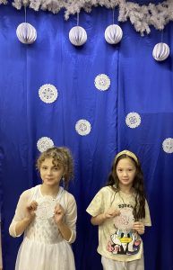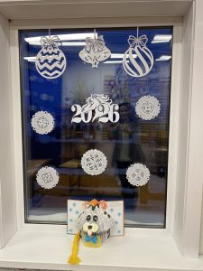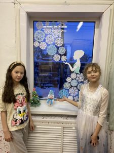 Обучающиеся ДШИ с преподавателями украсили школу к Новому году. Окна оформлены снежинками и вытынанками.