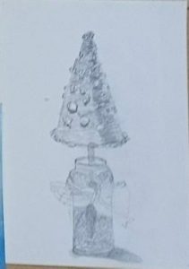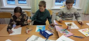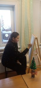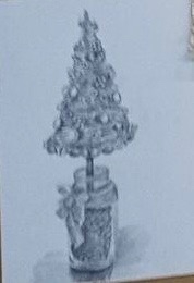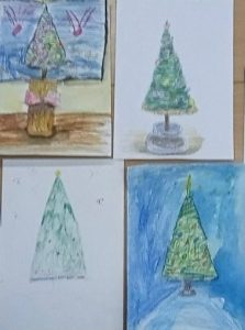 «Елочка из пряжи в вазе» по теме: «Новогодний натюрморт». Каждый ученик придумал своей ёлочке свой новогодний антураж и с использованием комбинированной техники (акварель + акварельный карандаш) завершили композицию.